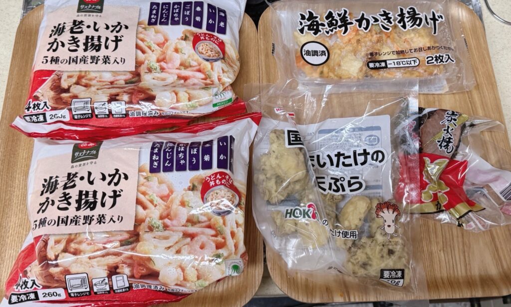 なぜかかき揚げが3つも。これら以外にも明太子の冷凍とかあった。