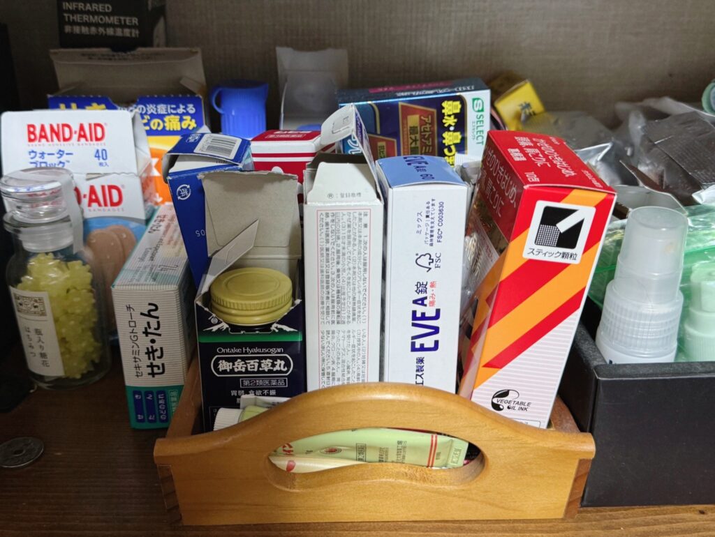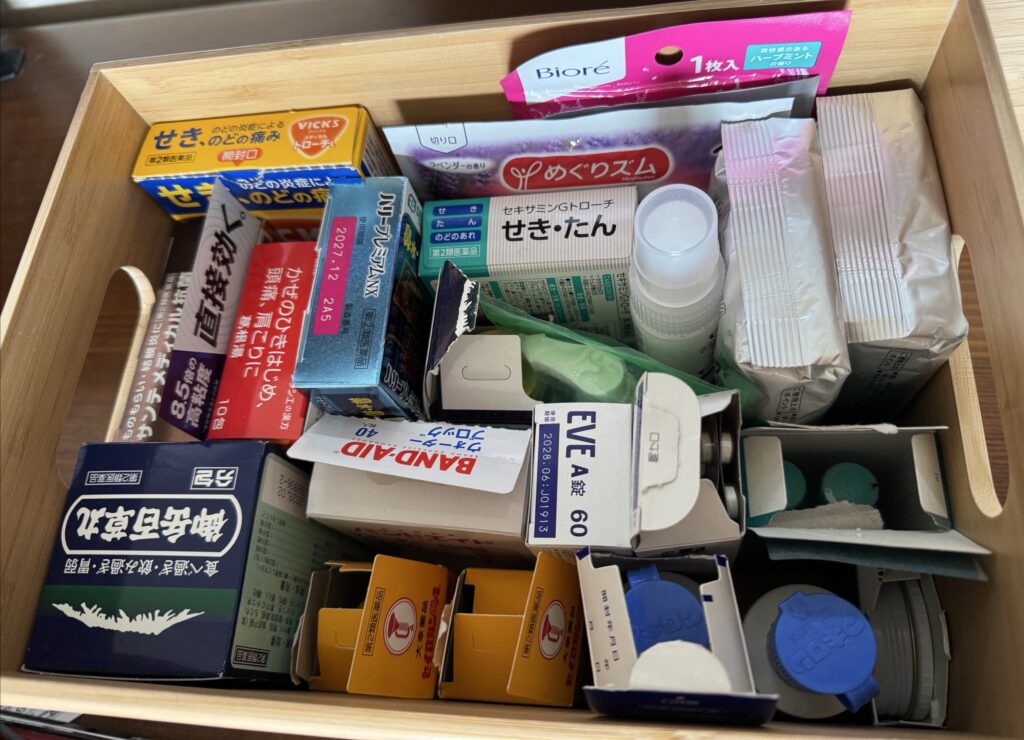 薬箱に入り切らない市販薬がこんなに雑に置いてある。