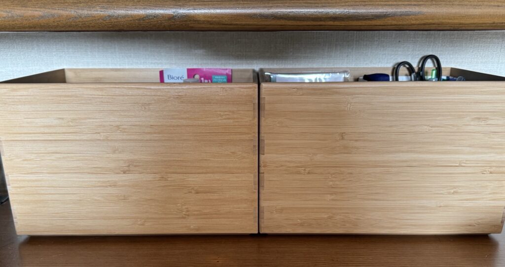 因みにこの箱は無印良品の『重なる竹材 長方形ボックス ハーフ 中』(1990円です)